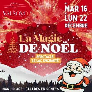 2025-12-16 17:00:00 2025-12-22 17:00:00 Europe/Paris Valsoyo présente La Magie de Noël 2025 Reservations on : http://www.valsoyo.com -- Petits et Grands,   Embarquez votre famille et vos amis vers un monde imaginaire où vos rêves de Noël se réalisent !   Cette édition 2025 sera le théâtre de nouvelles expériences féériques et inoubliables avec : Toujours plus d'animations avec des balades dans notre petit train "Le Tacot", la danse des lutins, des descentes en luges, la rencontre avec nos mascottes ou encore un tour dans notre manège ! Atelier maquillage et promenades en poneys [accès en supplément sur place] Notre nouveau spectacle original intitulé “Le Lac Enchanté”, l'histoire poétique et lumineuse d'une petite fille et son grand-père où la magie de Noël redonne le sourire. Elle croit à la fée du lac, lui non… que nous réservent-ils ! Partagez un moment gourmand à la Cantine et au Santa Bar des lutins.   Nous vous attendons pour :   17h00 : Ouverture du village de Noël avec des animations captivantes, des ateliers créatifs et des jeux d'antan pour toute la famille. 19h00 : Prenez part à notre nouveau spectacl… Valsoyo, Upie, France Valsoyo