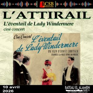 2026-04-10 20:00:00 2026-04-10 23:55:00 Europe/Paris VEN 10/04 : L'ATTIRAIL ciné concert Reservations on : https://www.billetweb.fr/ven-10-04-lattirail-cine-concert -- L'éventail de Lady Windermere Dans cet étonnant ciné concert, L’Attirail met en musique un film de 1925 réalisé par Ernst Lubitsch d’après une pièce d’Oscar Wilde. L’éventail de Lady Windermere est un bijou incontournable du cinéma muet, considéré comme un des meilleurs films de tous les temps. Pour la sortie de son nouvel album Le rébus de l’explorateur, L’Attirail reprend en trio ce superbe ciné-concert co-produit par Cannes Cinéma.   Xavier Demerliac : guitares, cigar box Chadi Chouman : guitare, banjo, percussions Clément Robin : accordéon, clavier Bateau El Alamein, Port de la Gare, Paris, France bateau el alamein