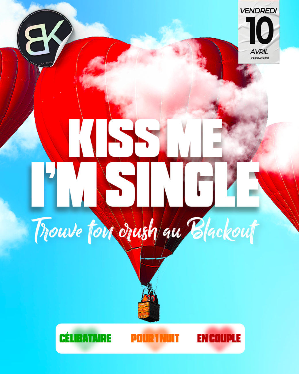 2026-04-10 23:30:002026-04-11 05:30:00Europe/ParisVendredi 10 Avril - Kiss Me : I'm SingleReservations on : https://www.billetweb.fr/vendredi-10-avril-kiss-me-im-single
