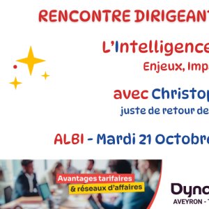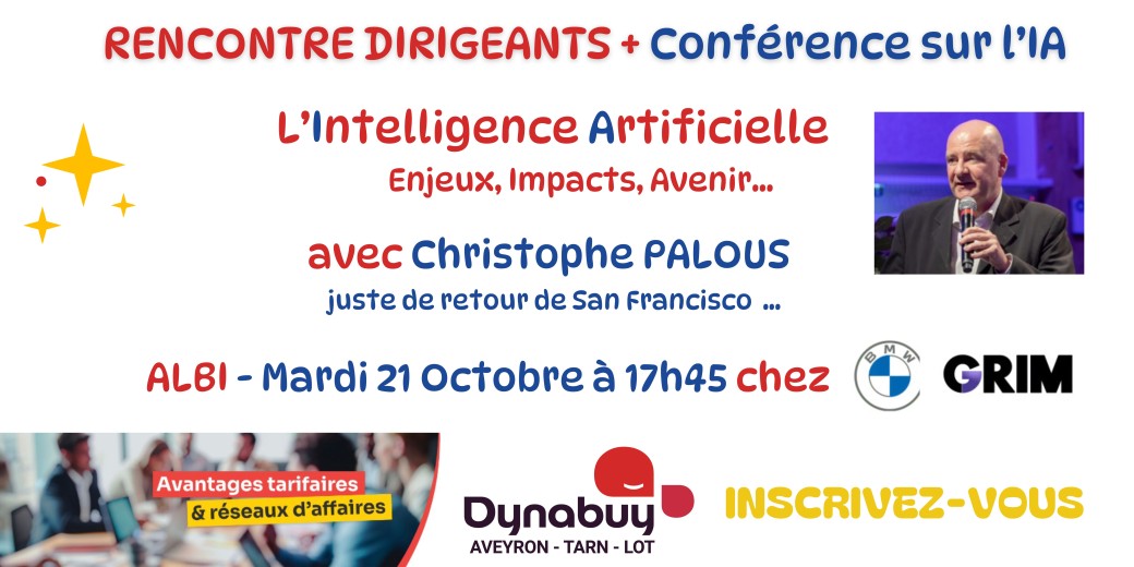 -> 18h00 : Conférence “IA - Intelligence Artificielle : enjeux, impact et avenir” - Intervention de Christophe PALOUS qui rentrera de San Francisco - Conseiller International TECHS & SERVICES CCI Occitanie