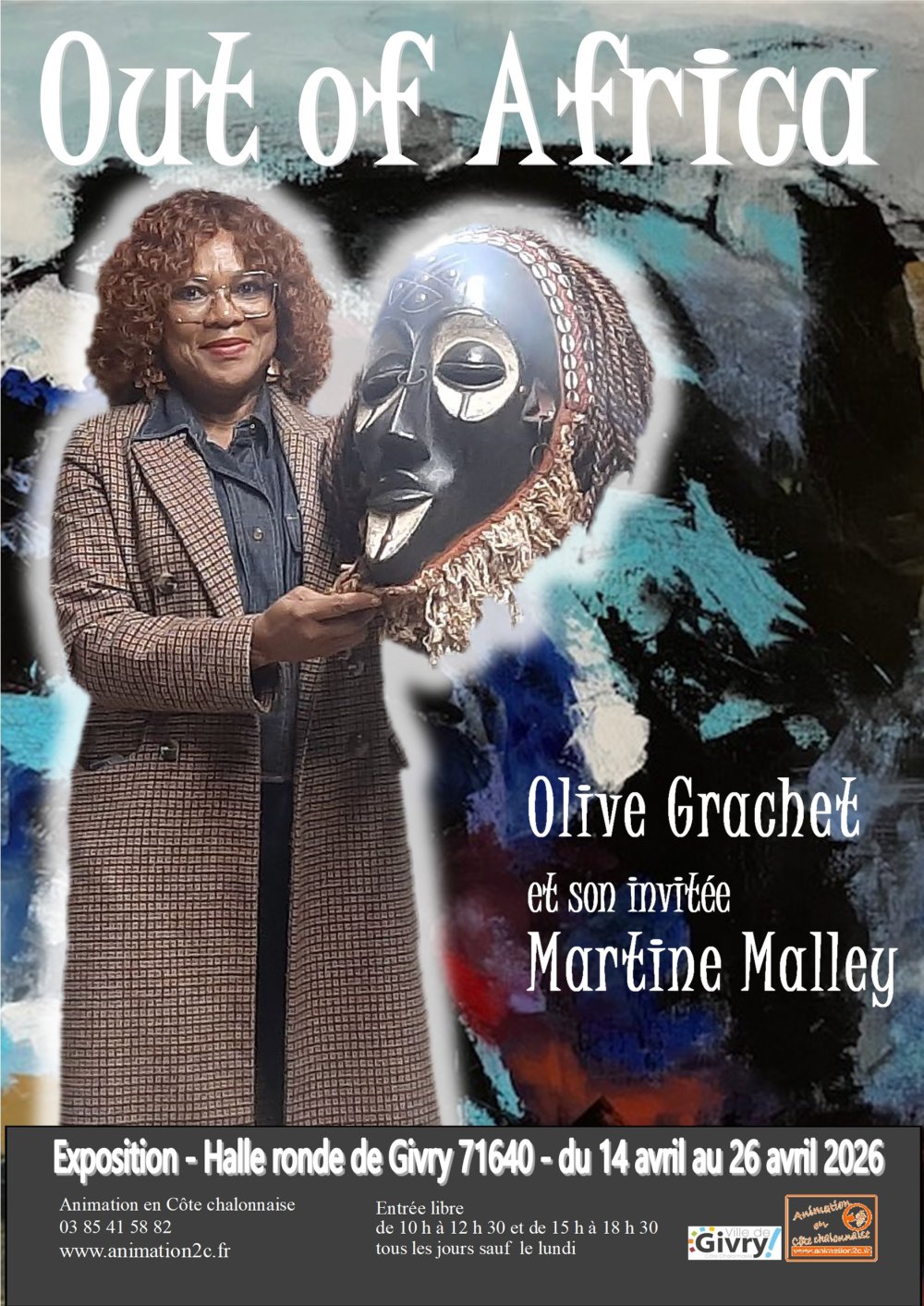 Martine Malley, accompagne ces souvenirs d'Afrique avec une série de tableaux abstraits qui tentent d'intercéder avec les esprits... Formée à l'école des beaux-arts de Chalon, Martine Malley peintre givrotine déclare : "La peinture m'ouvre un monde où le mouvement et la lumière disent le conflit, la tension, la fragilité. Pour ces acryliques et collages, j'entre dans un processus de libération de la réalité qui conjugue l'impulsion du geste, le rythme, l'évidence de l'imprévu. Peindre est ainsi un perpétuel besoin d'invention, plus qu'un plaisir, une passion."
