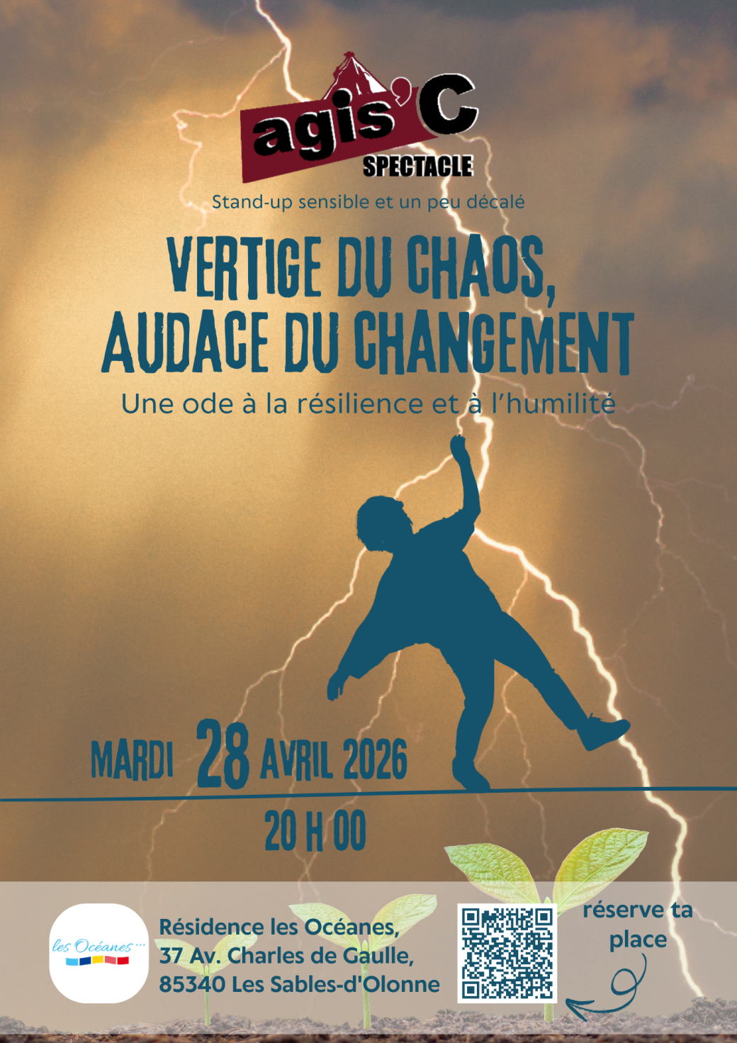 2026-04-28 20:00:00 2026-04-28 21:30:00 Europe/Paris Vertige du Chaos, Audace du Changement Reservations on : https://www.billetweb.fr/vertige-du-chaos-audace-du-changement1 -- Et si nos plus grandes ressources naissaient de nos plus belles gamelles ?   Dans ce spectacle mêlant stand-up sensible et confidences chaotiques, Agis’C plonge dans les turbulences du changement, les cadeaux bien planqués et les petits bouleversements intimes. Entre moments de rire et vérités qui cognent juste, on explore l'art de se réinventer quand tout s'effondre… et, avec style, bien sûr.   "Vertige du chaos, audace du changement", c’est un solo drôle, sincère et furieusement humain. Un spectacle pour tous ceux qui sont tombés, se sont relevés de travers, et ont fini par dire : "Je suis toujours debout, j’avance et c'est ok"   Résidence les Océanes 37 Avenue Charles de Gaulle Les Sables-d'Olonne Stéphanie HAMEL