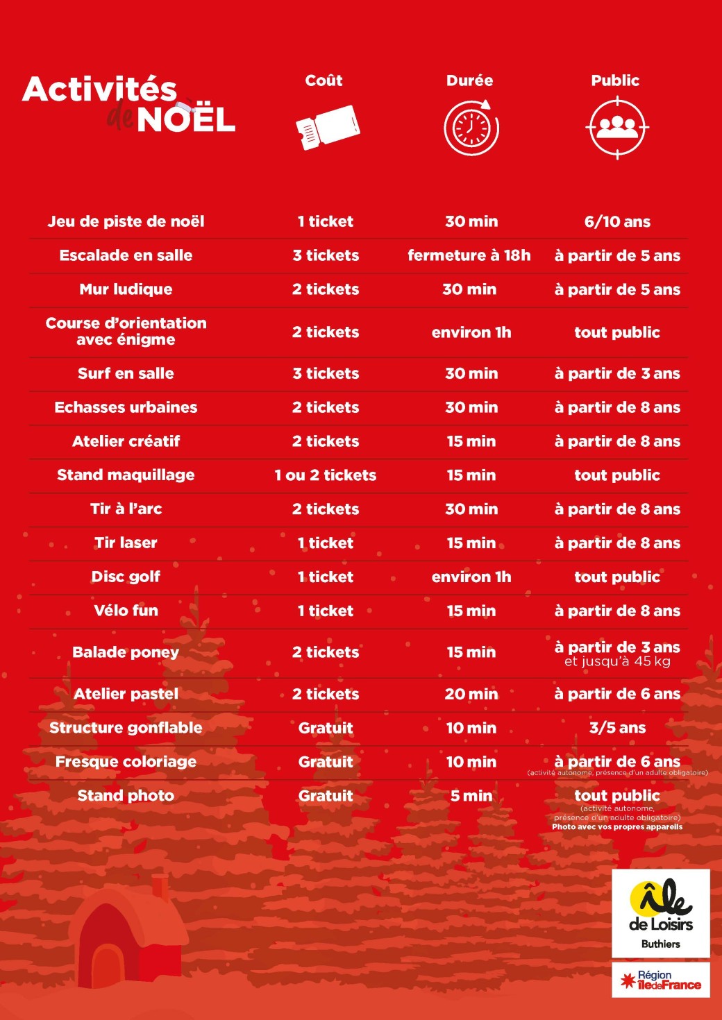 Les 8/15/21/22 décembre de 14h à 18h nous vous propsons des activités pour les petits et grands. Chaque activité coûte entre 1 et 3 tickets (qu'il faudra donner à l'animateur pour pratiquer) et dure entre 15min et 1h.