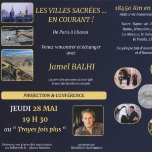 Durant cette projection, Jamel Balhi partagera les expériences qui ont fait vibrer son périple. Notre-Dame de Paris, Lourdes, le Vatican où il rencontra le pape Jean-Paul II, Jerusalem, le Mont Sinaï, La Mecque, il nous emmène au coeur des monothéismes. Après un an de course, l'Inde et son Gange sacré apparaissent, puis L'Himalaya et l'ancienne demeure du Dalaï Lama : le palais du Potala.
