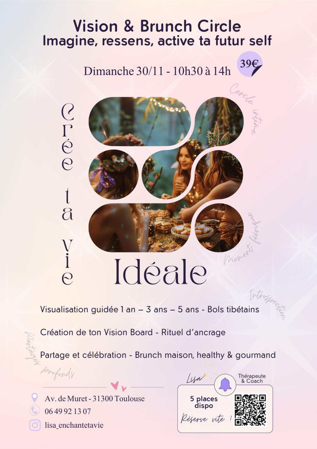 Cet atelier est un véritable reset intérieur, un moment suspendu pour te reconnecter à tes désirs, visualiser ton futur idéal et créer ton Vision Board – ton tableau d’intentions, d’énergie et de manifestation.