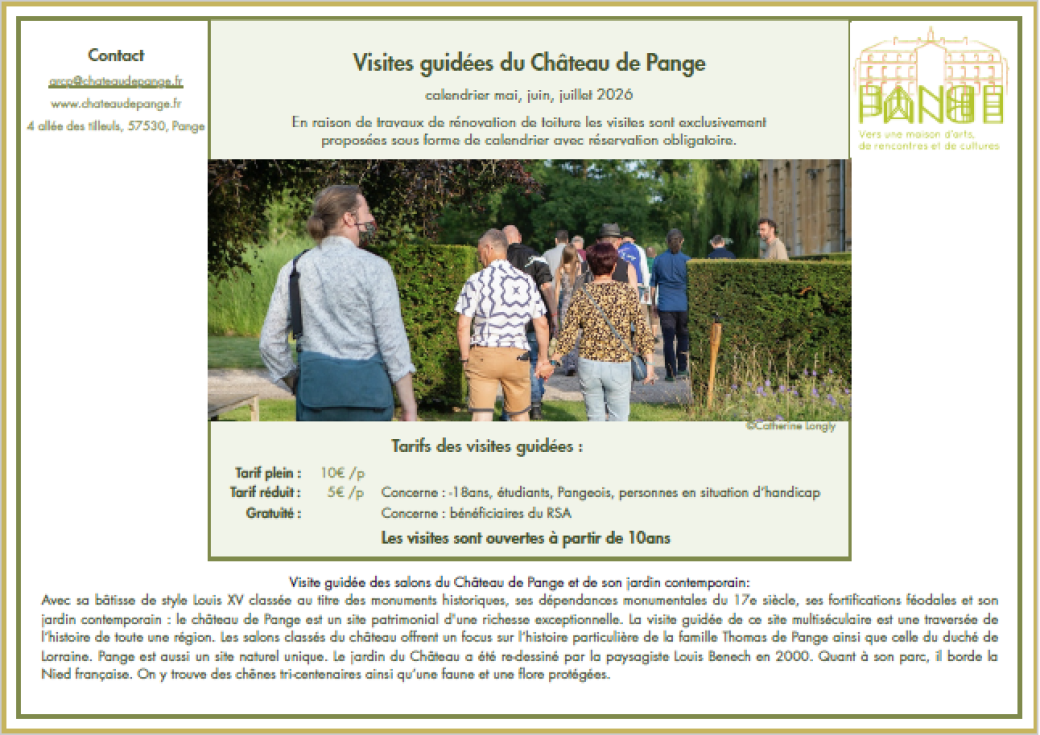 2026-05-14 15:00:002026-07-12 16:30:00Europe/ParisRéservations de visites guidéesReservations on : https://www.billetweb.fr/visites-guidees-2026-chateau-de-pange