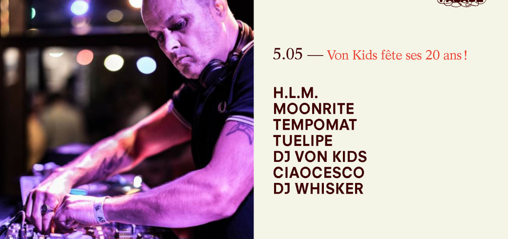 Von Kids, c’est 20 ans de danse au son des vinyles, 20 ans de mixes mémorables, d’amour et de partage de son. Il fête ça avec nous, en nous concoctant une soirée dont on se souviendra longtemps, sauf si vous oubliez de venir. Malheur à vous en ce cas, pensez donc à réserver au plus tôt !
