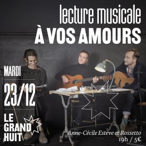 La lecture musicale « À vos amours” est le fruit des confidences amoureuses, recueillies et mises en texte par Anne-Cécile Esteve, et de sa rencontre avec le duo Rossetto (Pierre. C / Adrien Dutertre).