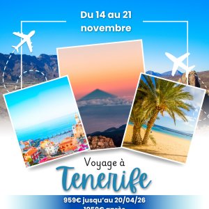2026-11-14 09:30:00 2026-11-21 09:00:00 Europe/Paris Voyage à Tenerife Reservations on : https://www.billetweb.fr/voyage-a-tenerife -- Nous avons le plaisir de vous proposer un séjour détente et danse au coeur des îles Canaries, ce magnifique ensemble d'îles volcaniques au reliefs escarpés. Nous nous rendrons sur la plus grande d'entre elles, la célèbre île de Tenerife ! Nous serons logés dans un complexe hôtelier 4 étoiles (****) Au programme, visite, danse, beach party, soirées latino... 1 semaine de fiestaaa !    Le tarif comprend:   - Vol Aller / Retour départ de Nice ou Paris Pour un départ d'une autre ville, contacter l'organisateur. - L'hôtel 4 (****) en chambre double (ou triple sur demande) - Petits déjeuners et dîners - Visite des sites touristiques  - Soirées latino - Beach party   959€ jusqu'au 20 avril 1059€ après   Paiement en 4 fois possible ! Tenerife, Espagne Allosalsa