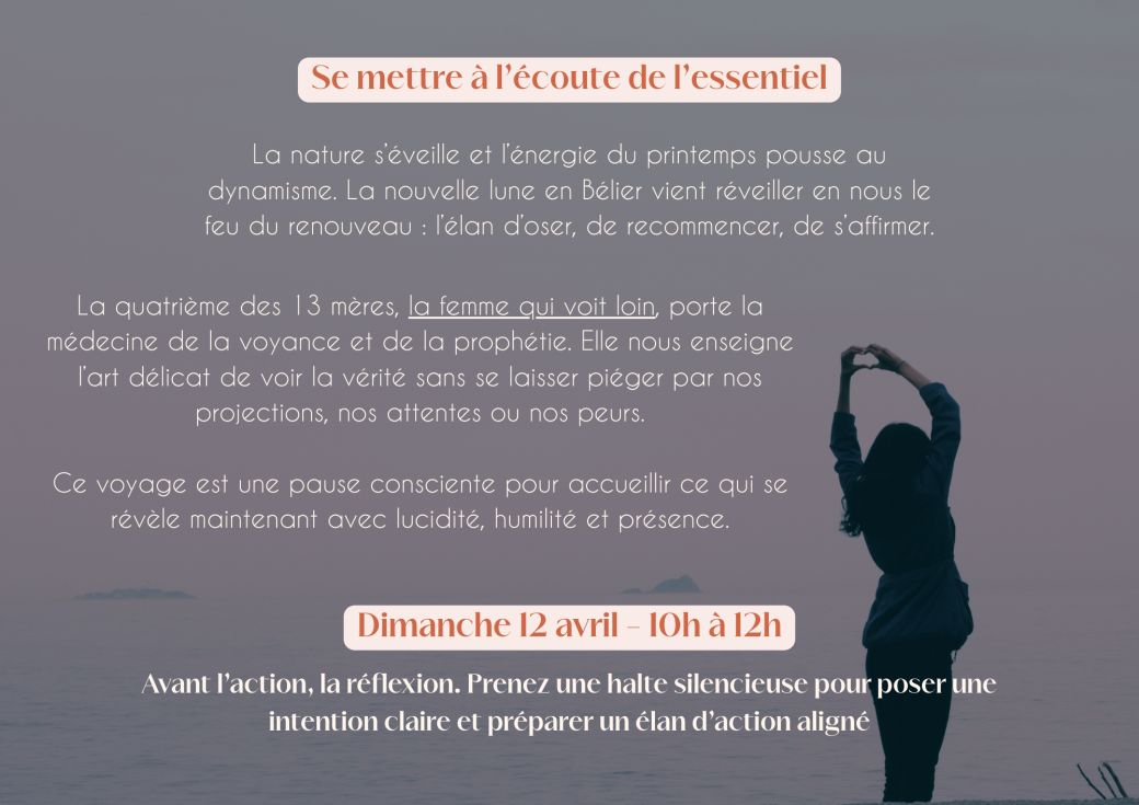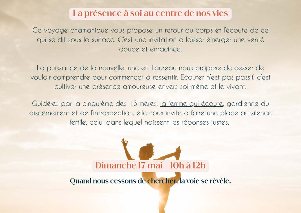 Pour chaque voyage chamanique, je propose de venir travailler dans une dynamique. Pour plus de détails, toutes les informations sont dans la description générale.