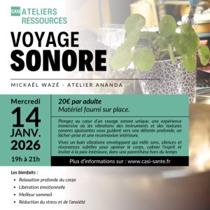 2026-01-14 19:00:002026-07-08 21:00:00Europe/ParisVoyage SonoreReservations on : http://www.AtelierAnanda.fr