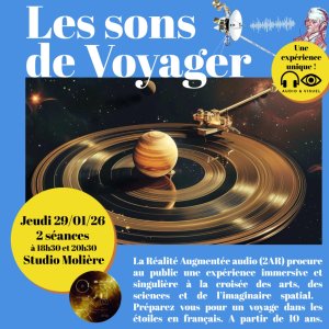 2026-01-29 18:30:00 2026-01-29 21:30:00 Europe/Paris Les sons de Voyager Reservations on : https://www.billetweb.fr/voyager-au-moliere --   Made in France présente   Une expérience sonore et visuelle inédite, la tête dans les étoiles!   En 1977, profitant d’un alignement des planètes ayant lieu une fois tous les 170 ans, la NASA lance deux sondes identiques, Voyager 1 et Voyager 2, partir explorer le système solaire. 47 ans plus tard, après avoir survolé Jupiter, Saturne, Uranus, Neptune et 48 de leurs satellites, les deux sondes, toujours en état de fonctionnement, se situent aux confins du système solaire.   Ce documentaire, conçu comme une installation immersive in situ, raconte en images modélisées et par le prisme d’archives sonores cette incroyable épopée, émaillée de découvertes scientifiques majeures et de sonorités inouïes. Un système de spatialisation et d'immersion sonores place les auditeurs, équipés de casques à conduction osseuse, au cœur d’une expérience où le pouvoir évocateur et narratif d’un son en 3 dimensions augmente le sentiment d’immersion transmis par les images modélisées du film documentaire. … Studio Molière, Liechtensteinstraße 37, 1090 Vienne Festival du rire francophone Vienne