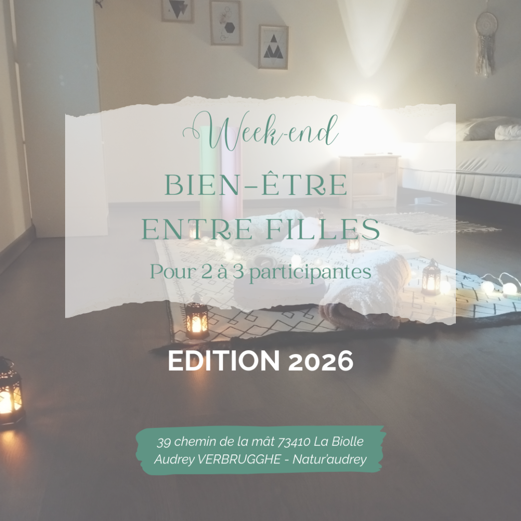 2026-05-29 17:00:00 2026-05-31 14:00:00 Europe/Paris Week-end Bien-être entre filles Reservations on : https://www.billetweb.fr/week-end-bien-etre-entre-filles -- 2 à 3 participantes max Intimité - convivialité - authenticité garanties   Que vous veniez entre mère et fille(s), entre soeurs ou entre amies, offrez-vous un moment pour ralentir, respirer et vous reconnecter à l'essentiel.   A la Biolle, au coeur de la Savoie, je vous accueille dans un cocon douillet, propice à la détente et à la reconnexion avec soi.   Votre séjour comprend : - Deux nuits dans un logement confortable et cosy, pensé pour vous faire souffler. - Un coin cocooning sur place : tapis de yoga, coussins de méditation, plaids, bougies, ... - Une boîte à outils saisonnière à explorer en autonomie : carnet, mandalas, lectures bien-être, encas sains et bien d'autres surprises - Un atelier bien-être d'1h : lié à la saison ou à un thème spécifique - Un massage ayurvédique au choix de 30 minutes par participante - Un accès à l'Espace Aqua-détente des thermes d'Aix-les-bains : piscines, sauna, hammam + 1 boisson offerte par participante - Petit-déjeuners compris. Vous recevrez des… La Biolle, France Audrey Verbrugghe EI