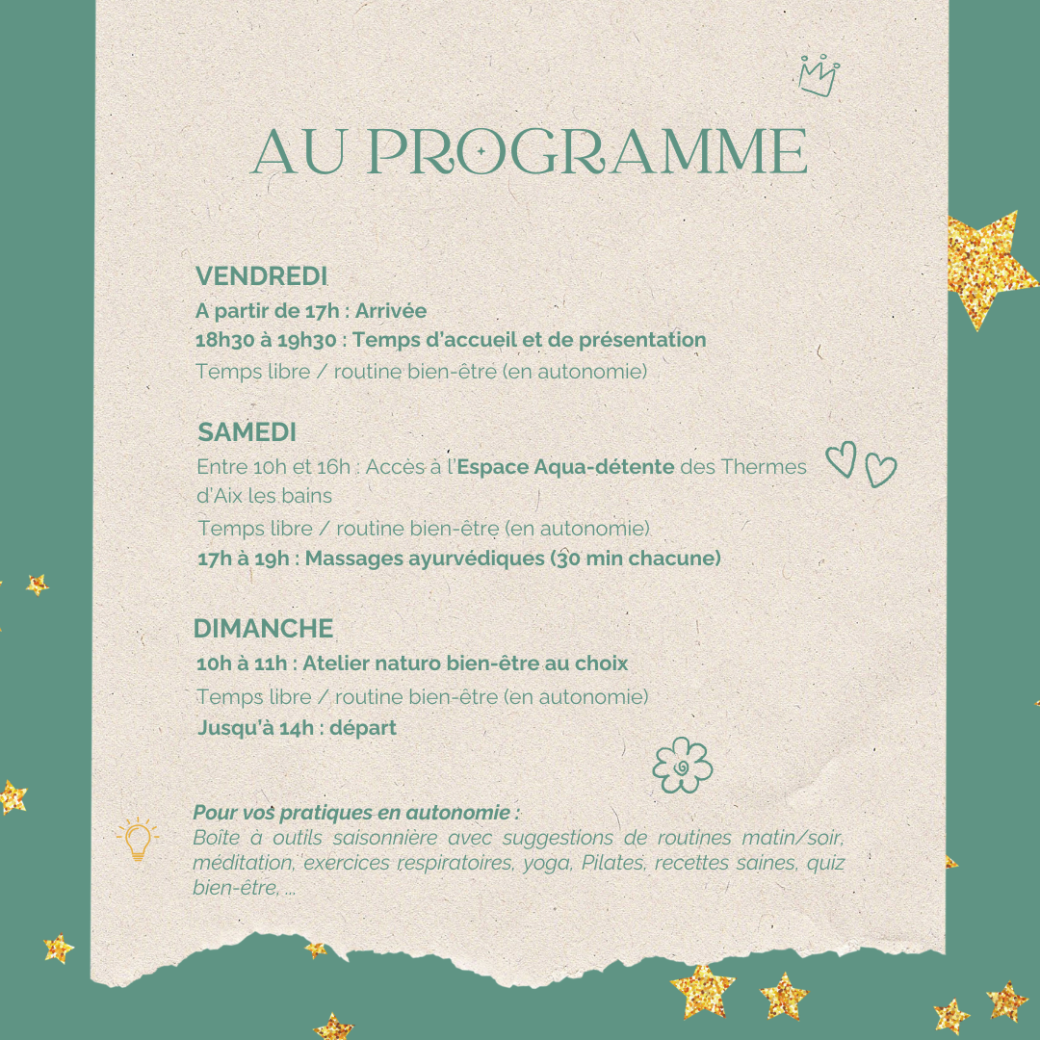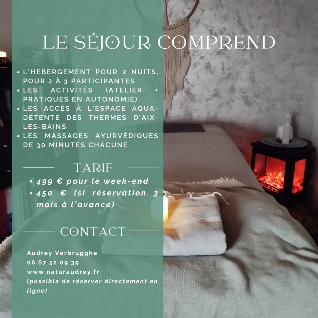 2026-11-13 17:00:00 2026-11-15 14:00:00 Europe/Paris Week-end Bien-être entre filles Reservations on : https://www.billetweb.fr/week-end-bien-etre-entre-filles4 -- 2 à 3 participantes max Intimité - convivialité - authenticité garanties   Que vous veniez entre mère et fille(s), entre soeurs ou entre amies, offrez-vous un moment pour ralentir, respirer et vous reconnecter à l'essentiel.   A la Biolle, au coeur de la Savoie, je vous accueille dans un cocon douillet, propice à la détente et à la reconnexion avec soi.   Votre séjour comprend : - Deux nuits dans un logement confortable et cosy, pensé pour vous faire souffler. - Un coin cocooning sur place : tapis de yoga, coussins de méditation, plaids, bougies, ... - Une boîte à outils saisonnière à explorer en autonomie : carnet, mandalas, lectures bien-être, encas sains et bien d'autres surprises - Un atelier bien-être d'1h : lié à la saison ou à un thème spécifique - Un massage ayurvédique au choix de 30 minutes par participante - Un accès à l'Espace Aqua-détente des thermes d'Aix-les-bains : piscines, sauna, hammam + 1 boisson offerte par participante - Petit-déjeuners compris. Vous recevrez des… La Biolle, France Audrey Verbrugghe EI
