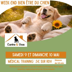 Marie, de Canine et Vous, propose une séance de medical training, une approche douce et positive qui permet d’habituer votre chien aux manipulations (soins, examens, gestes du quotidien) tout en renforçant la confiance et la coopération