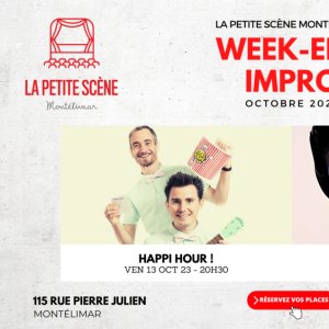 2023-10-13 20:30:00 2023-10-14 22:00:00 Europe/Paris Week-end Impro Montélimar Octobre 2023 Reservations on : http://www.lapetitescene.fr -- COMPLET pour les deux spectacles de ce week-end !    Mais...   PROCHAIN WEEK-END : 17 ET 18 NOVEMBRE ! ACHETEZ VOS PLACES DÈS MAINTENANT EN LIGNE :   Billetterie Week-end Impro Novembre     *HAPPI HOUR* / VEN 13 OCT / 20H30 / TOUT PUBLIC Dans une ambiance très Broadway, trois serveurs en nœuds papillons vous serviront des sketches inédits à partir des sujets que vous aurez commandés. Hilarité garantie.   *DE L'AUTRE CÔTÉ DU MIROIR...* / SAM 14 OCT / 20H30 / À PARTIR DE 12 ANS PIÈCE IMPROVISÉE - Une soirée qui commence bien. Des amis, de la famille, un intrigant bibelot déniché dans une petite brocante. Et la peur, qui s'insinue...   TARIFS : 1 spectacle : 12€ / 9€ (réduit pour -12 ans et demandeurs d'emploi) 2 spectacles : 20€ / 15€ (réduit pour -12 ans et demandeurs d'emploi)   LA PETITE SCÈNE se situe au 115 rue Pierre Julien à Montélimar La petite scène, 115 Rue Pierre Julien, Montélimar, France Happi La Compagnie