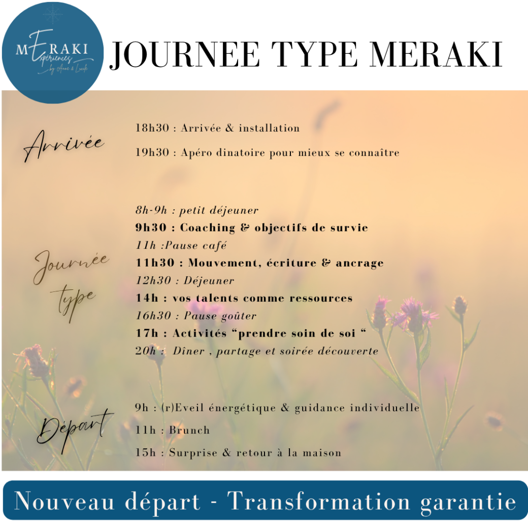 2026-10-29 18:30:00 2026-11-01 15:00:00 Europe/Paris Un Week end pas comme les autres - OCTOBRE Reservations on : https://www.billetweb.fr/weekend-meraki-octobre -- L'expérience MERAKI, c'est un week end ou tout peut se transformer. Un moment pour se découvrir, se rencontrer et repartir d'ici aligné, motivé et des ressources pour commencer ce qui te tient à coeur, et que tu as trop longtemps retenu.   Nous te proposons d'oser, de prendre un nouvel élan parce que 2026 est une année de nouveau départ.  Si tu souhaites reprendre ta route avec confiance, sérénité et enthousiasme, nous te garantissons une transformation intérieure profonde et durable pour que le chemin soit à la hauteur de tes envies, tes besoins et que tu incarnes qui tu es vraiment. Rejoins nous au séminaire de juin ou octobre pour de donner toutes les clés d'un changement nécessaire et que tu sais déjà transformateur.                                         " Des possibilités & des ressources "    Le stage de 3 jours :  Combine différentes approches complémentaires Intègre corps, esprit et énergie Propose des pratiques concrètes et accessibles Permet une progression personnalis… Bannes, Mayenne, France Meraki_France