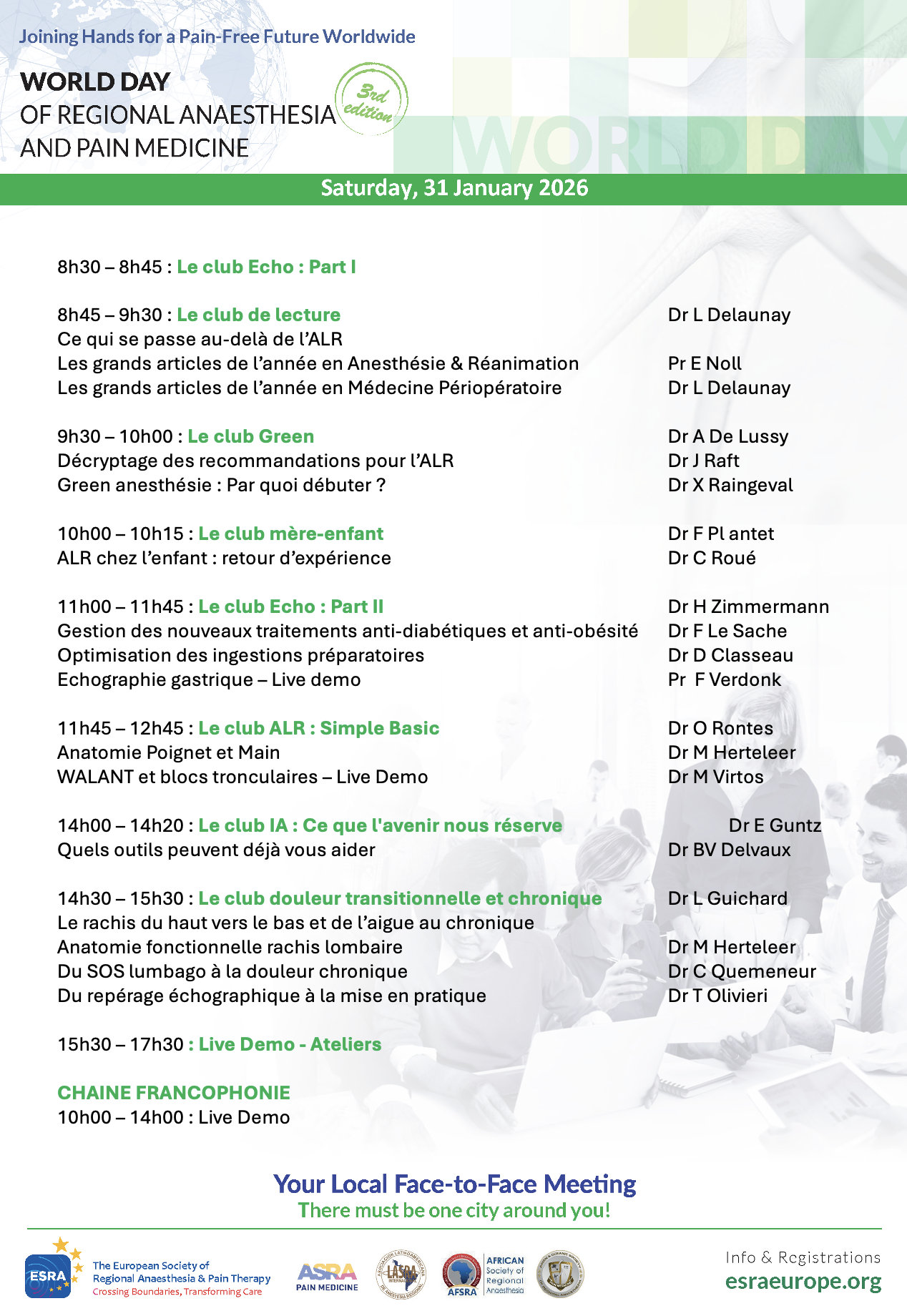 2026-01-31 08:00:002026-01-31 08:00:00Europe/ParisWorld Day of Regional Anesthesia and Pain Medicine Reservations on : https://www.billetweb.fr/world-day-of-regional-anesthesia-and-pain-medicine1