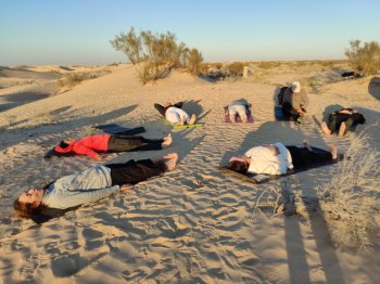 4e jour : Séance de yoga au lever du jour. Rando d'environ 2h, pique-nique salade et sandwichs, reprise de la marche méditative jusqu’à la dune de Erg. Karma Yoga: si souhaité aide au déchargement ou temps libre. Diner et bivouac.